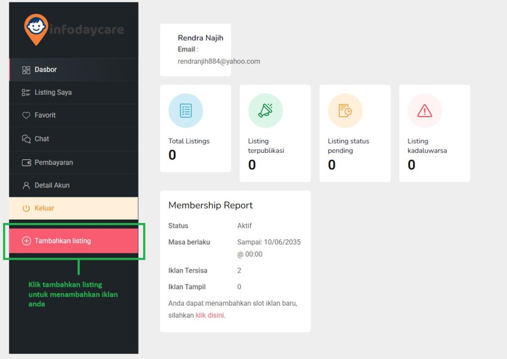 - Untuk membuat listing baru, silahkan klik tombrol Tambahkan Listing dari menu sebelah kiri