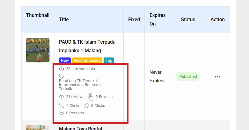 Untuk dapat mengetahui performa iklan anda, silahkan masuk pada member area, lalu klik Listing Saya. Anda akan melihat tampilan daftar iklan anda seperti pada gambar berikut ini. Kolom merah menunjukkan statistik iklan yang telah anda pasang.